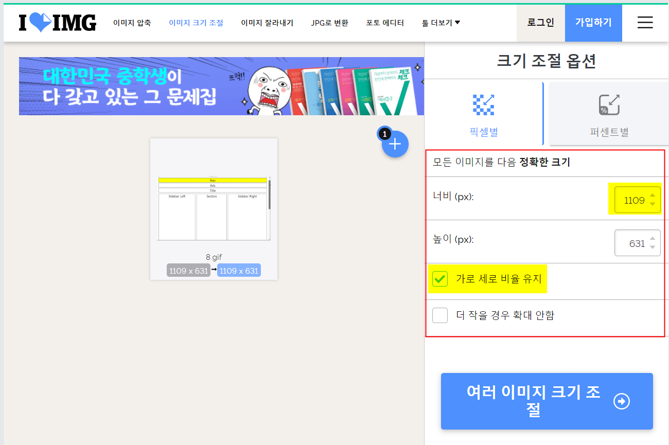 파일을 그래그 후 아래 화면과 같이 전환되면 수정하고 싶은 크기를 지정합니다. 아래 그림과 같이 가로 세로 비율 유지가 선택되어 있으면 너비(px) 또는 높이(px)만 입력하면 됩니다. 입력 완료 후 우측 하단의 여러 이미지 크기 조절을 클릭합니다.