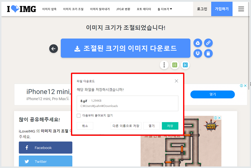 리사이즈된 파일은 위 그림에서 여러 이미지 크기 조절 버튼을 누른 후 아래와 같이 약간의 로딩을 거친 후에, 파일을 다운로드 하는 팝업창에서 다운로드 할 수 있습니다. 아래와 같이 파일 다운로드 팝업창이 뜨지 않으면 웹 페이지의 조절된 크기의 이미지 다운로드 버튼을 클릭하면 다운로드 할 수 있습니다.
