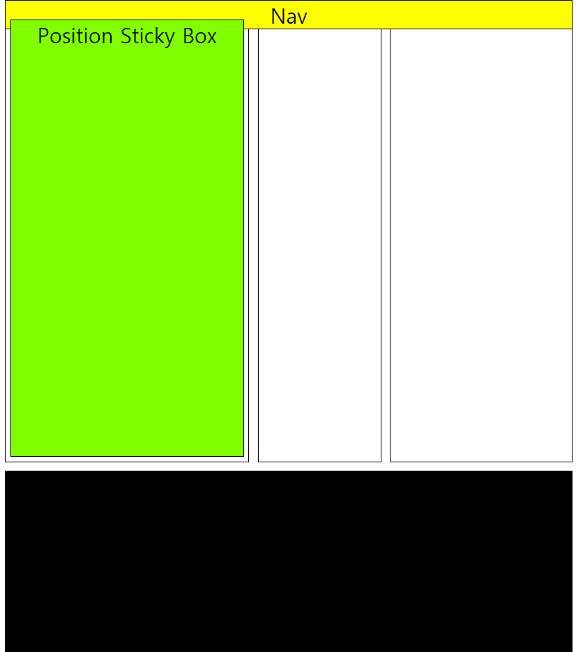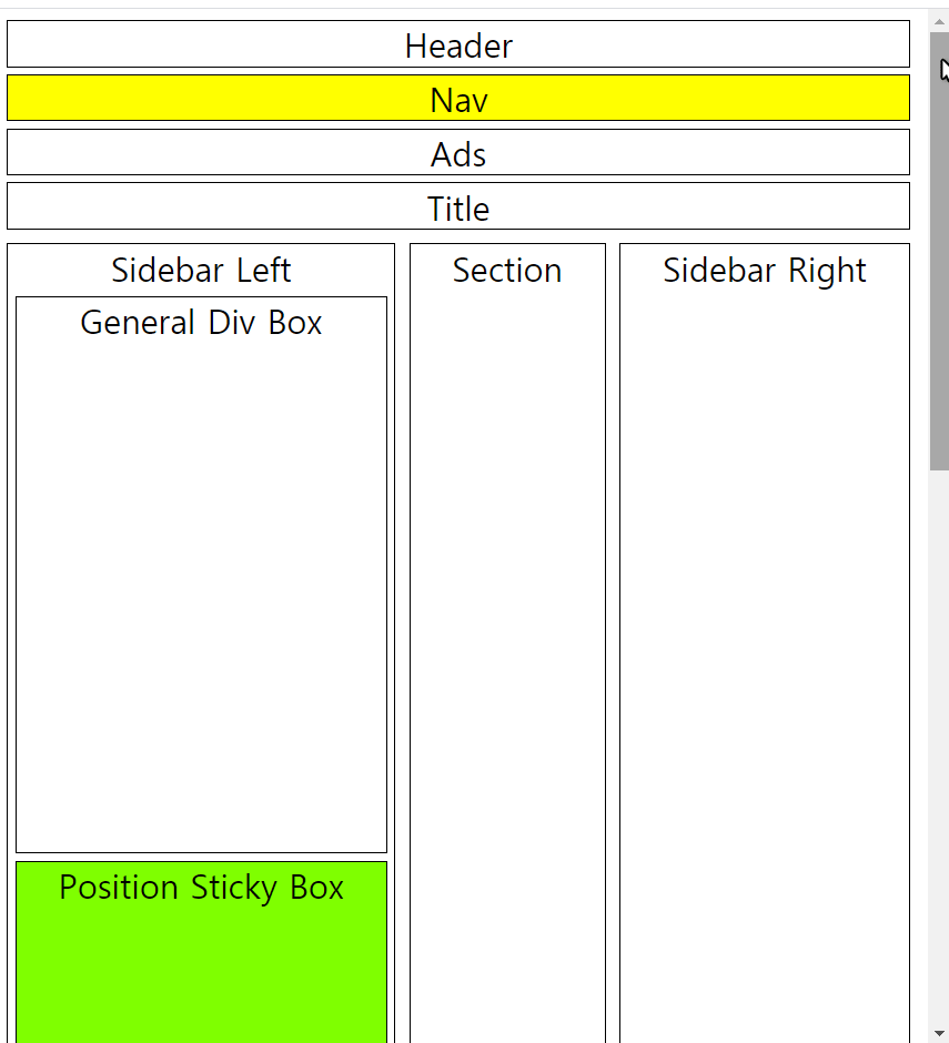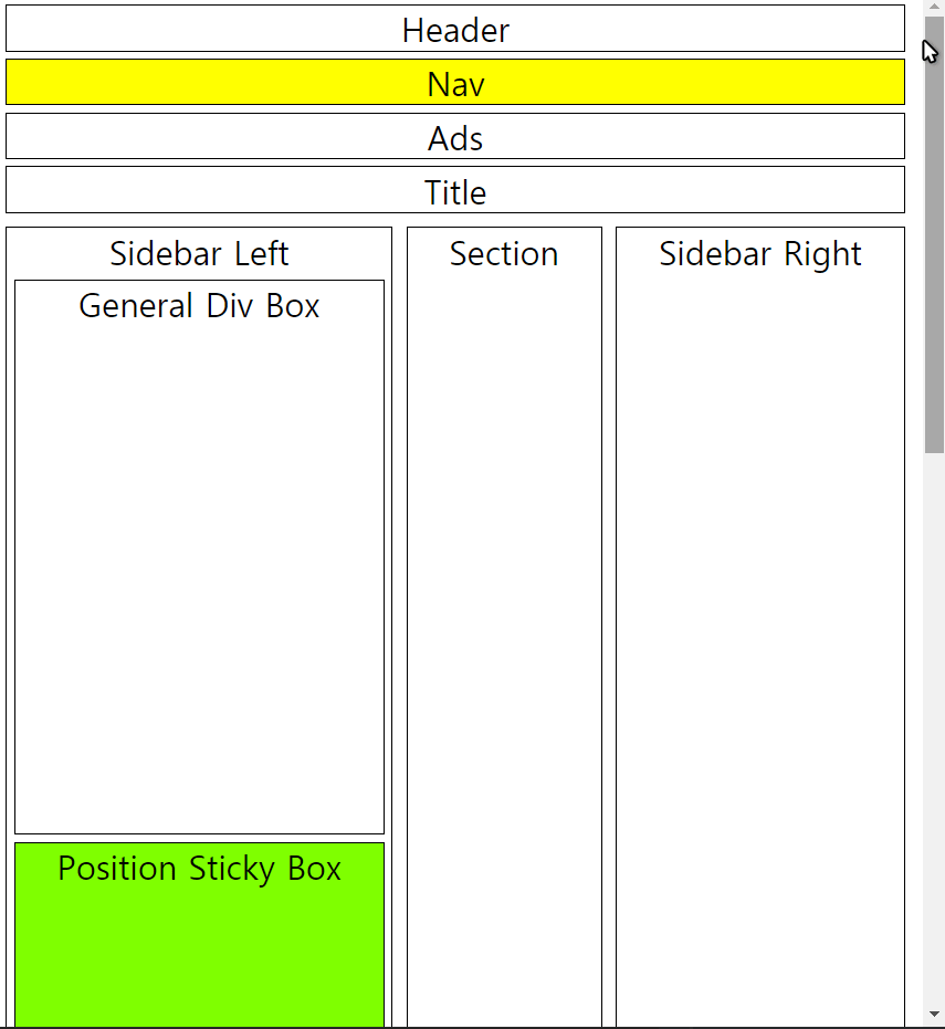 위의 레이아웃 구조를 만든 후에 Sticky로 동작할 div 요소만 position: sticky; 속성과 top:0px 속성을 지정하면 편리하게 스크롤에 따라 고정되는 사이드바를 만들 수 있습니다.