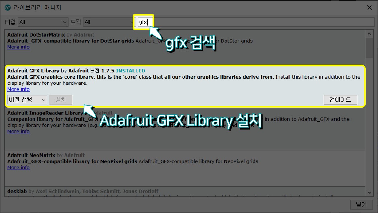 라이브러리 설치 방법은 아두이노 라이브러리 매니저에서 GFX를 검색 후 Adafruit GFX Library를 찾아 설치하면 됩니다.
