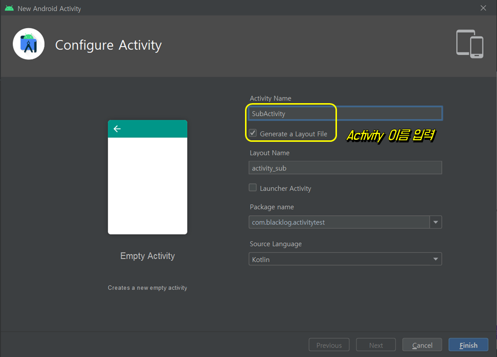 app > java 폴더에서 마우스 우클릭후 Empty Activity 추가합니다. 추가할 액티비티의 이름은 SubActivity로 지정합니다.