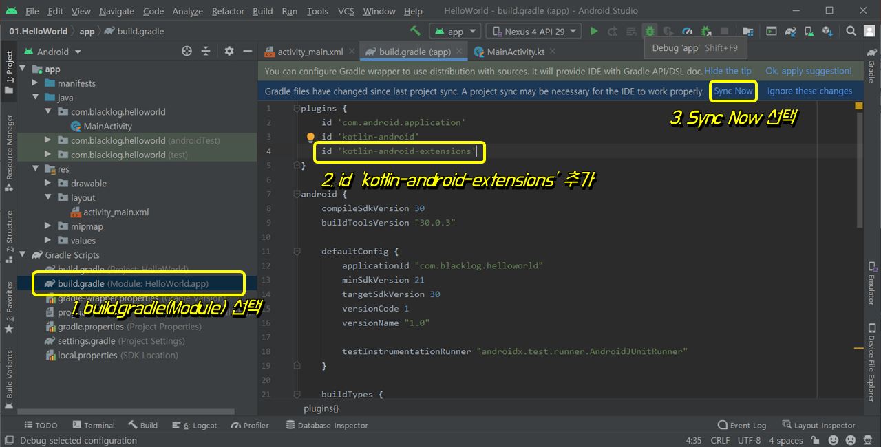 App > Gradle.Scripts > build.Gradle(Module) 파일의 plugins에 id 'kotlin-android-extensions'를 추가합니다. 플러그인을 추가하고 Sync Now를 선택합니다.