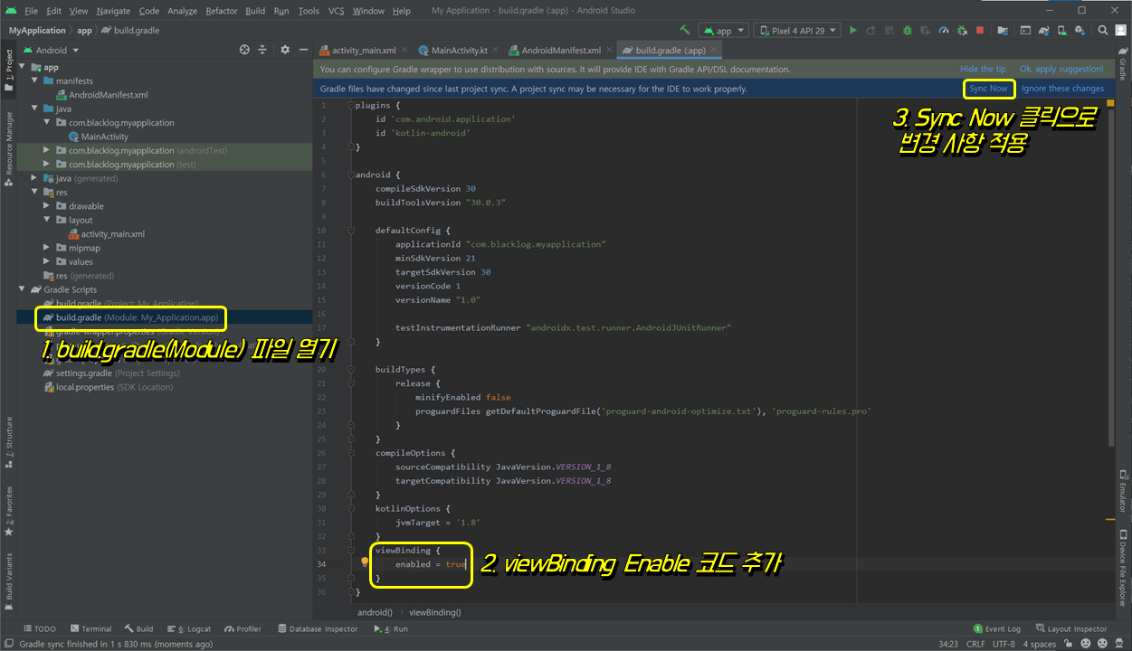 build.gradle(Module) 파일에 viewBinding 요소를 추가합니다.