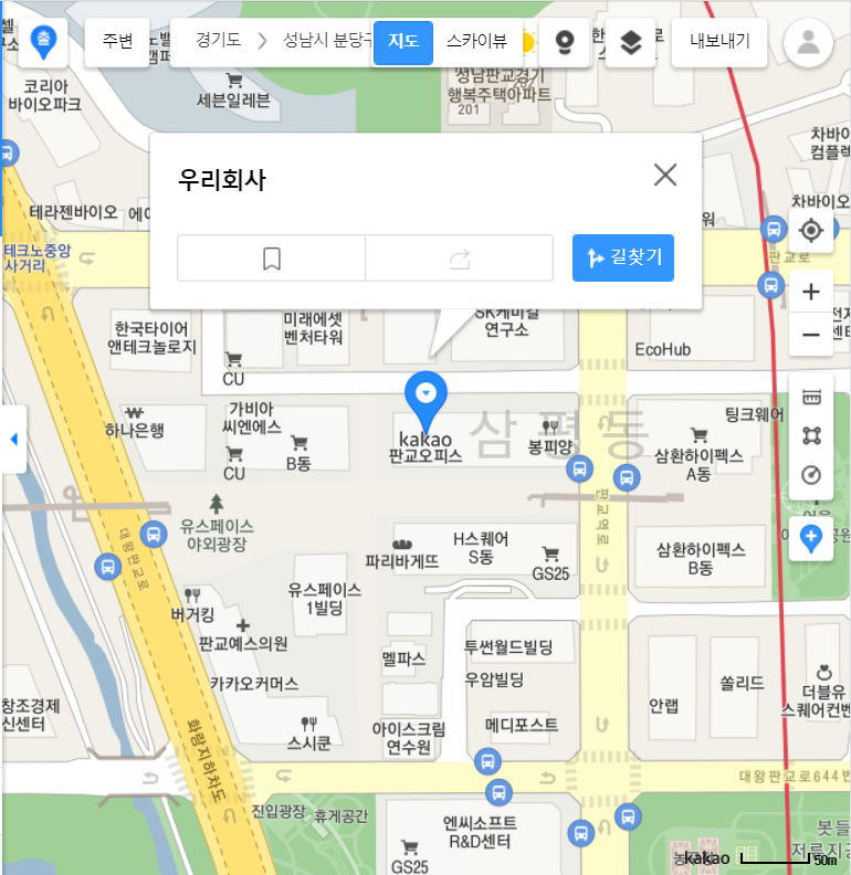 - /link/map/이름, 위도,경도 👉 map.kakao.com/link/map/우리회사,37.402056,127.108212
