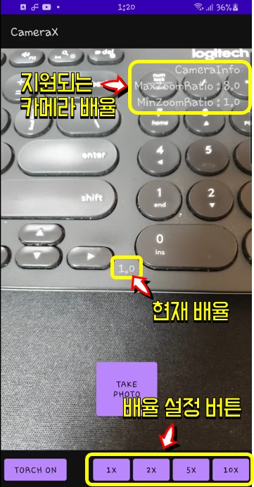 위 코드를 실행하면 아래와 같이 지원되는 카메라 배율과, 현재 배율이 표시되는 것을 확인 할 수 있고, 배율 버튼을 누르면 정상적으로 카메라 배율이 조정되는 것을 확인 할 수 있습니다. 참고로 아래 그림에 사용된 폰은 삼성 갤럭시 노트9입니다.